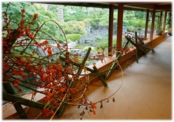 また、いけばなは草月流師範会顧問でイケバナインターナショナル会員としてご活躍中の鹿取琢磨様の作品を展示。昨年秋のお彼岸にも大変ご好評いただいた催しです(下写真はご臨終の間 裏回廊に展示した昨秋の作品。今回は客殿での開催となりますのでご注意下さい)。